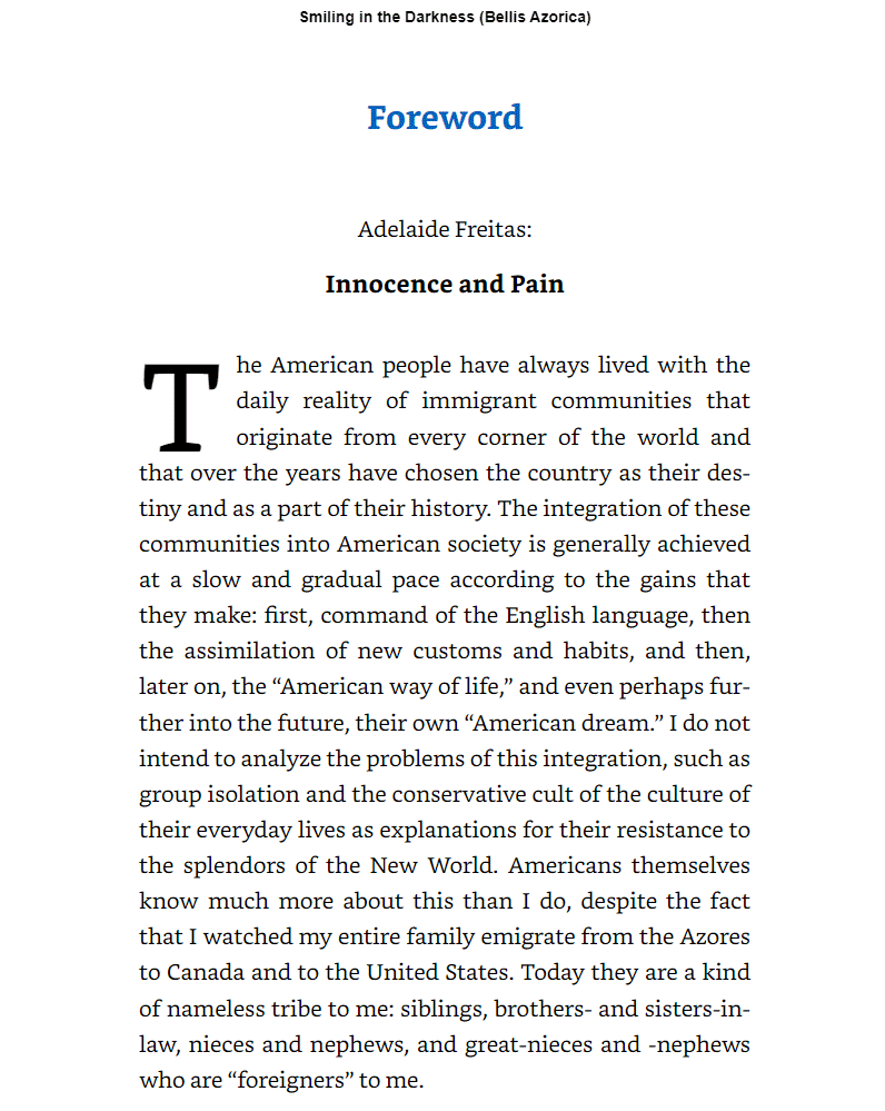 Many people of Portuguese descent take pride in claiming that the word “saudade” is untranslatable. In reality, we come close with a melding of bittersweet nostalgia, bone-deep longing, and an endless yearning for what one can never have again―or indeed may never have had. Adelaide Freitas dipped her pen in saudade to tell of family separation and bonds that never loosen. In her authentic Azorean voice, she recounts the immigrant experience and centrifugal impulses that force people apart in spite of their desperation to cling to one another. In their sensitive rendering, the translators have captured the nuances of Freitas’s novel Smiling in the Darkness, with special care for those who have her native language in their heritage and heartfelt saudade for its loss.