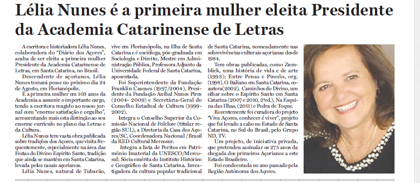 The Brazilian writer and historian Lélia Nunes has just been elected the first female President of the Santa Catarina Academy of Letters in Brazil.