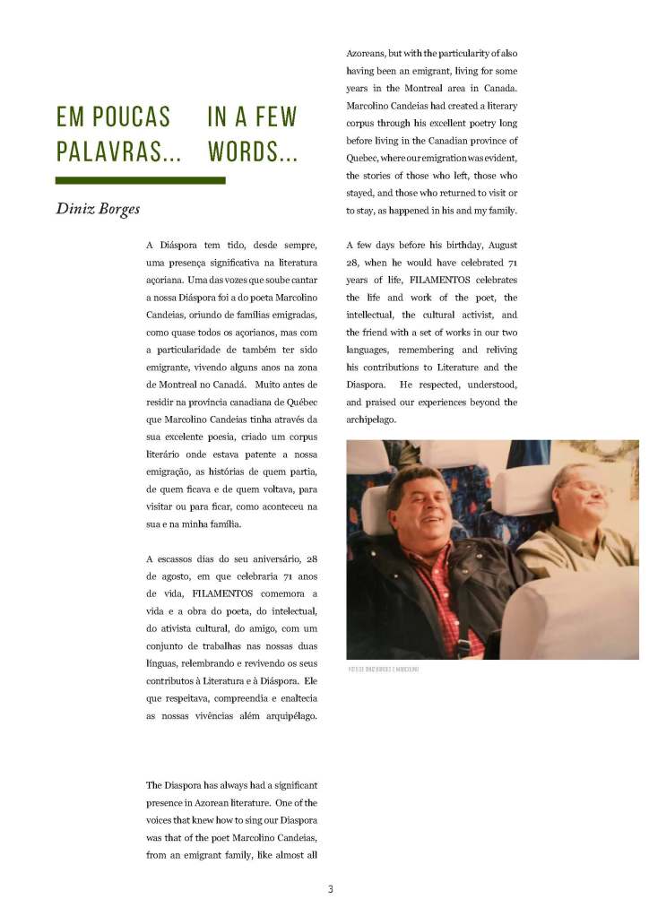 This edition is dedicated to the poet Marcolino Candeias and launched on what would have been his 71st birthday. Marcolino was a poet who understood the Azorean Diaspora and the role of the arts in the Azorean spirit, independently of geography or generational differences.