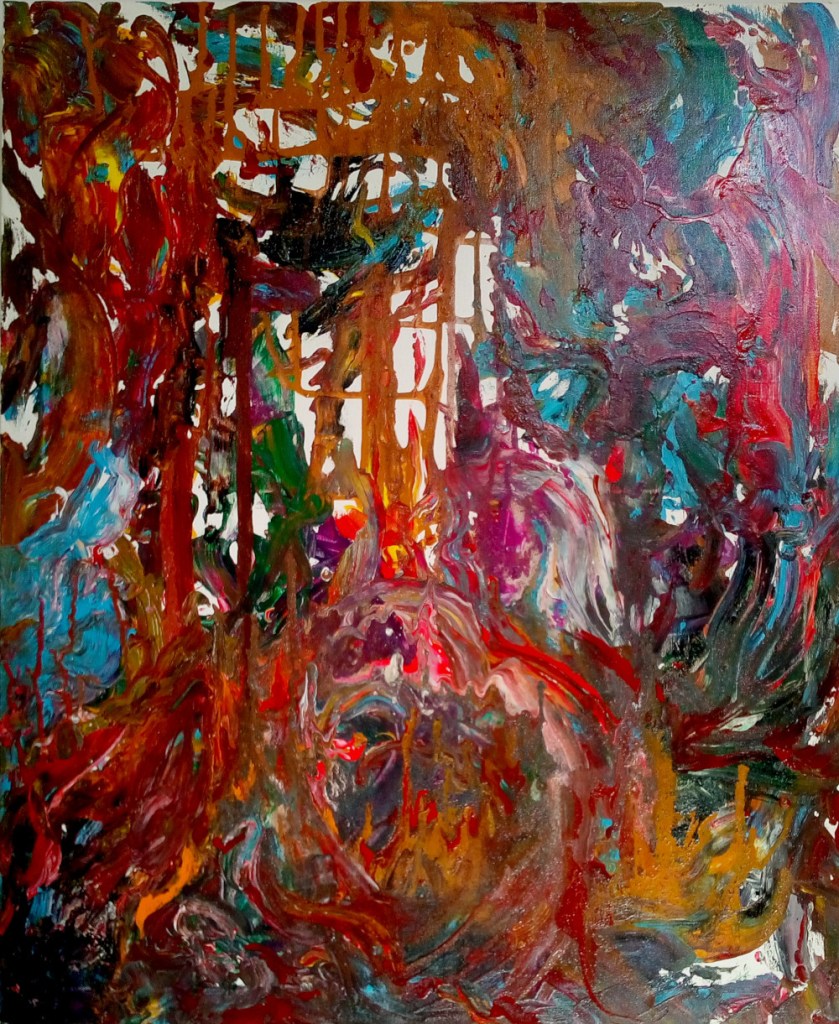 I paint with various materials, whether charcoal, dry pastel, oil pastel, watercolors, or mixed media. One of my strangest works to date and the one that aroused the most curiosity was a self-portrait I did in acrylic on a plastic bag, which is what I had on hand. I have to paint, so I use whatever I have. When I have to paint, I have to paint. I didn’t have any other medium then, and that’s where I painted.