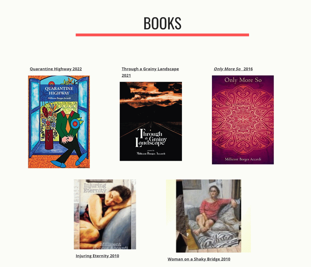 Millicent Borges Accardi, a Portuguese-American poet, is the author of four poetry collections: Quarantine Highway, Through a Grainy Landscape, Injuring Eternity, and Only More So.