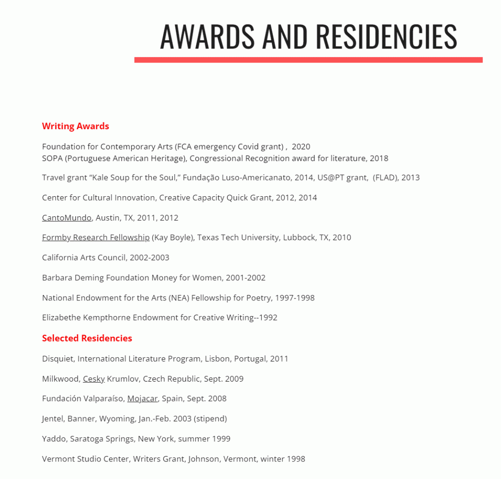 Among her awards are fellowships from the National Endowment for the Arts (NEA), California Arts Council, CantoMundo, Fulbright, Foundation for Contemporary Arts NYC (Covid grant), Creative Capacity, and Barbara Deming Foundation, “Money for Women.”