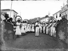 c) Entrudo Dances. Like the others, they were essentially based on a choreography accompanied by a few quatrains. They were often linked to arts or crafts: dances of the nets (fishermen), of the picón, of the mallets, of the blacksmiths, carpenters, etc. Towards the end of the 19th century, the plot began to assert itself and later became the central element of the dance, transforming it into popular theater. This introduction of the enredo seems to coincide with the same opening of the enredo in the Brazilian samba. They existed on all the islands and, after suffering a period of decline, have recently reappeared. They only maintained their continuity on the island of Terceira, becoming the most prominent cultural manifestation. Practically every parish has one or more dances for Carnaval, which involves several hundred people.
