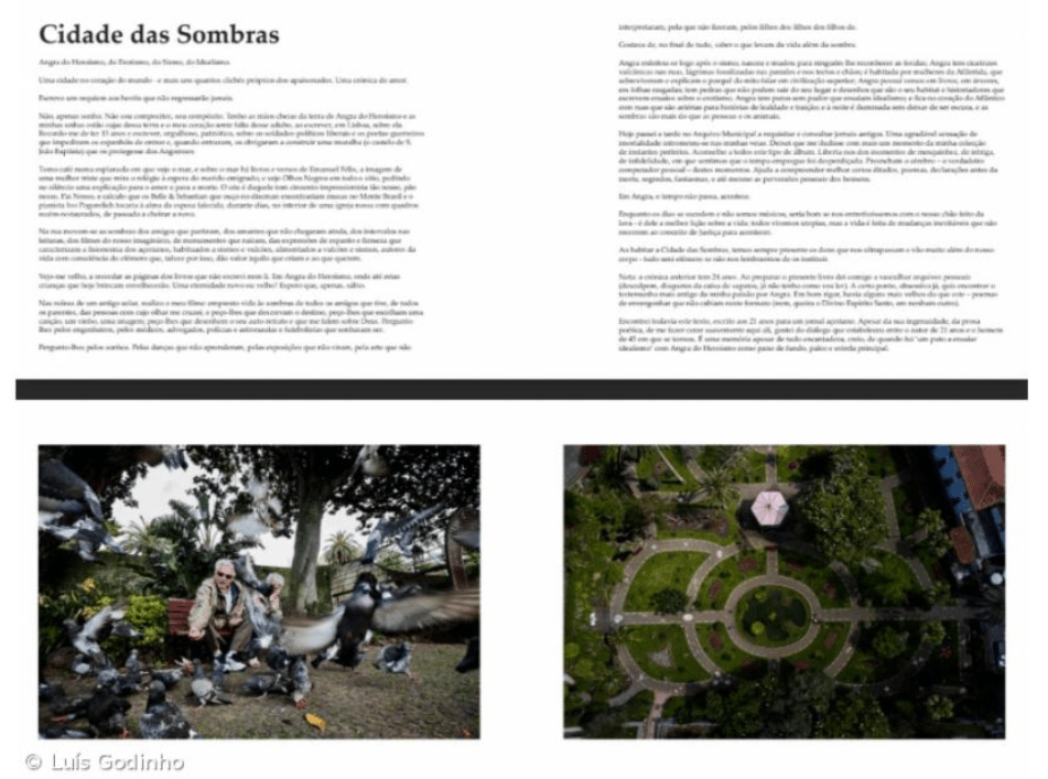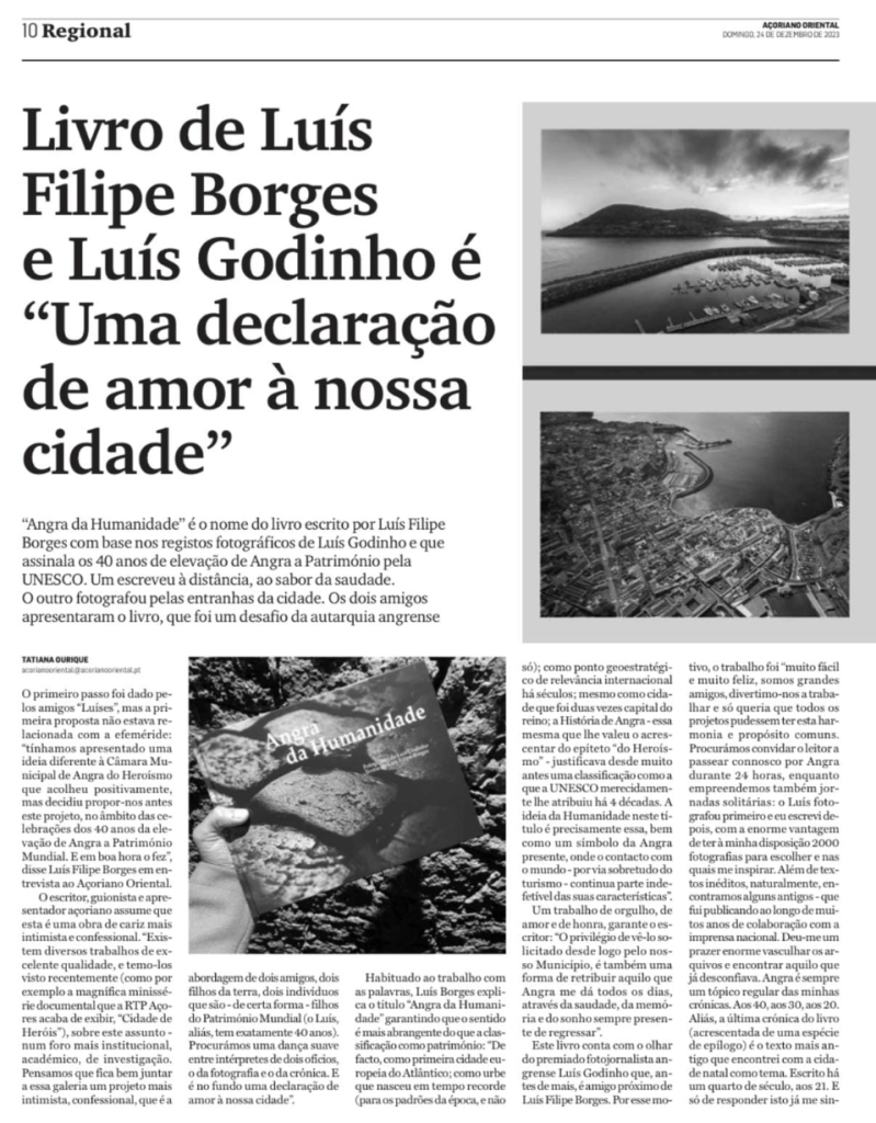 This book features the work of award-winning Angra photojournalist Luís Godinho, a close friend of Luís Filipe Borges. For this reason, the work was “straightforward and very happy; we’re great friends, we have fun working, and I just wanted all the projects to have this common harmony and purpose. We tried to invite the reader to walk around Angra with us for 24 hours, while we undertook solitary journeys: Luís photographed first, and I wrote afterward, with the enormous advantage of having 2000 photographs at my disposal to choose and draw inspiration from. As well as unpublished texts, of course, we found some old ones – which I had published over many years of collaboration with the national press. It gave me great pleasure to rummage through the archives and find what I had already suspected. Angra is always a regular topic in my chronicles. At 40, at 30, at 20. In fact, the last chronicle in the book (plus a sort of epilogue) is the oldest text I’ve found with the hometown as its theme. It was written a quarter of a century ago, at 21. And just answering this makes me want to book an urgent health check-up,” the author laughs.