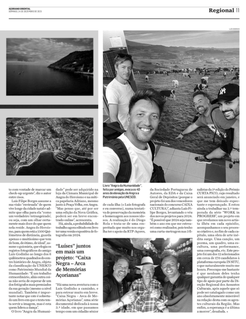 “There’s a new adventure with Luís Godinho on the way, and it’s due to premiere very soon. “Caixa Negra – Arca de Memórias Açorianas,” a documentary series dedicated to our senior citizens, in which we spend time with a senior citizen from each island (Luís photographs and I talk) in an attempt to preserve the memory and pay homage to our elderly. It’s directed by Diogo Rola, and we’re very proud to have the support of RTP-Açores, Sociedade Portuguesa de Autores, EDA, and Caixa Geral de Depósitos (because the project was one of the national winners of the CAIXA CULTURA competition),” says Luís Filipe Borges, lifting the veil on the new projects for 2024. “It’s possible that 2024 will also be the year in which I make my debut as a director, as I have a short film in the top 3 finalists of the 1st edition of the CURTA PICO Award, the results of which will be announced in January, and which I’m looking forward to and hopeful about. And I’m still working on the 2nd season of the series “WORK in PROGRESS”, a project in which we reveal a new island artist in each episode, follow their creative process and, at the end of each chapter, a new work of art appears. A song, a poem, a painting, a sculpture, a performance, a choreography, etc. This project was one of 12 selected out of around 170 European IN SITU platform applicants, which I’m naturally very honored about. I’m very concerned that none of them has any guarantee of any kind of support from the Regional Directorate for Cultural Affairs after what can only be described as an absolutely miserable year in its relationship with the region’s cultural agents. But in the end, hope is the last to die,” he says.
