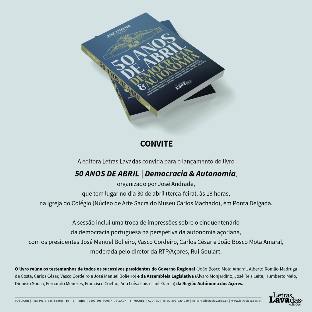 O lançamento do seu novo livro,50 ANOS DE ABRIL | Democracia & Autonomia, ocorrereu nos dias 24 (Angra do Heroísmo), hoje, dia 29 (Horta) e 30 de abril (Ponta Delgada). O que contém esta obra?