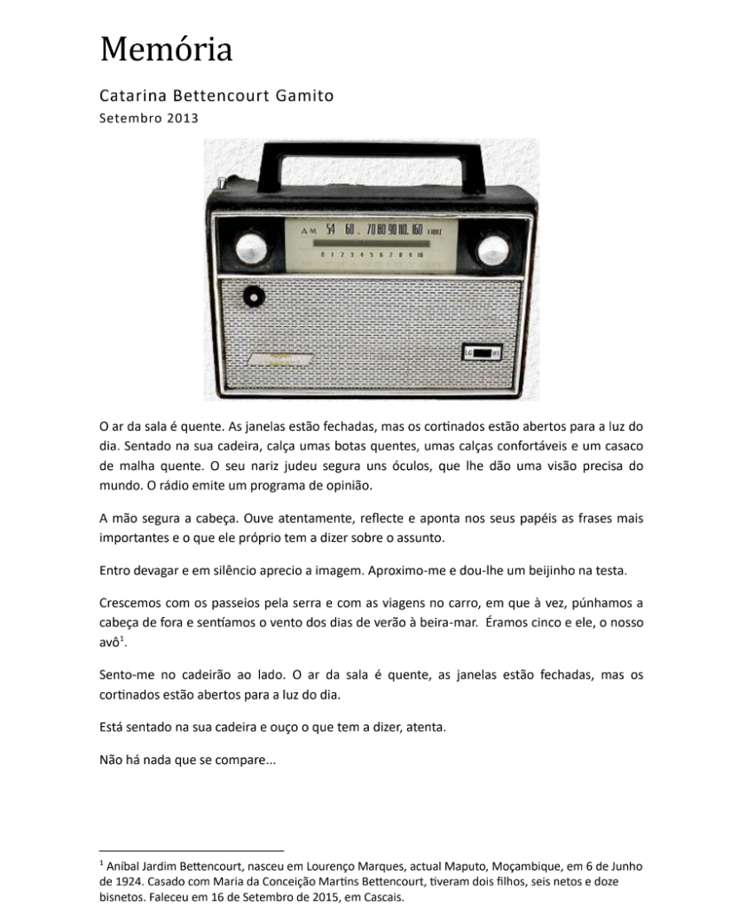 Hoje nos Filamentos (arts e letras na diáspora) começamos a publicar uma série de textos deliciosos do Comandante Jorge Bettencourt (e das suas filhas a Catarina e a Joana) sobre o centenário do seu pai e avô Aníbal. São textos criativos, com uma doçura emocionante e que nos mostram a importância do elo da família e do amor. Num mundo cada vez mais agressivo e onde os poderes, desde o político ao económico, nos ensinam a indiferença e o ódio, é tão bom lermos e refletirmos textos desta natureza. Daí que, nas próximas semanas, e todas as semanas, teremos um texto diferente. Agradecemos aos autores a generosidade de nos permitirem a partilha com a nossa diáspora. Convidamos quem queria partilhar textos semelhantes, ou diferentes, a entrarem em contacot connosco através do e-mail dborges@mail.fresnostate.edu