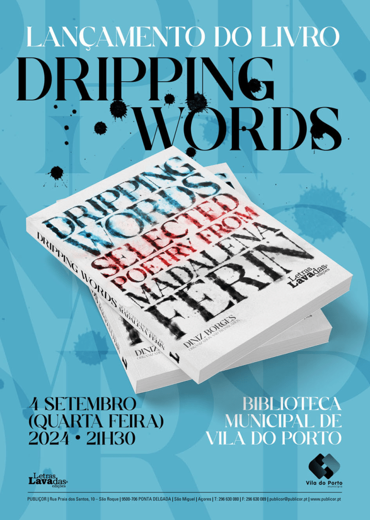 The Vila do Porto Municipal Library will host the launch of the book “Dripping Words – Selected Poetry from Madalena Férin” organized and translated by Diniz Borges, published by Bruma Publications and Letras Lavadas, on September 4 from 21:30 to 9:30 PM).