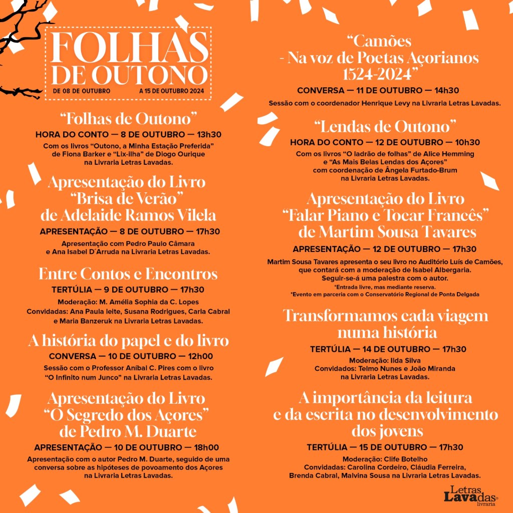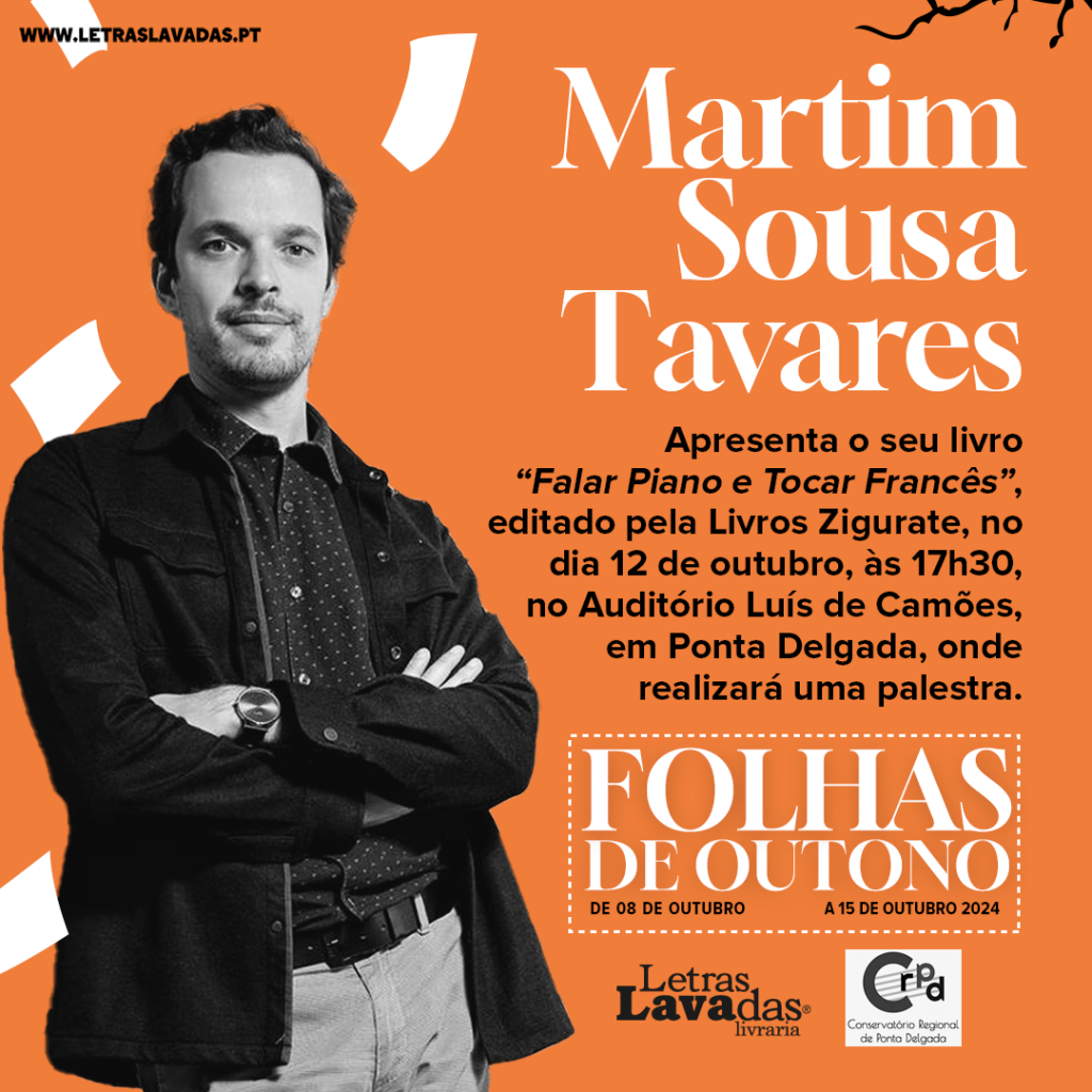 O Festival Literário “Folhas de Outono”, decorre na livraria Letras Lavadas de 8 a 15 de outubro, em que se destaca a presença de Martim Sousa Tavares, que lançará o seu livro “Falar Piano e Tocar Francês — Arte, cultura e humanismo na era dos memes” e dará uma palestra, no dia 12 de outubro às 17h30 no Auditório Luís de Camões.