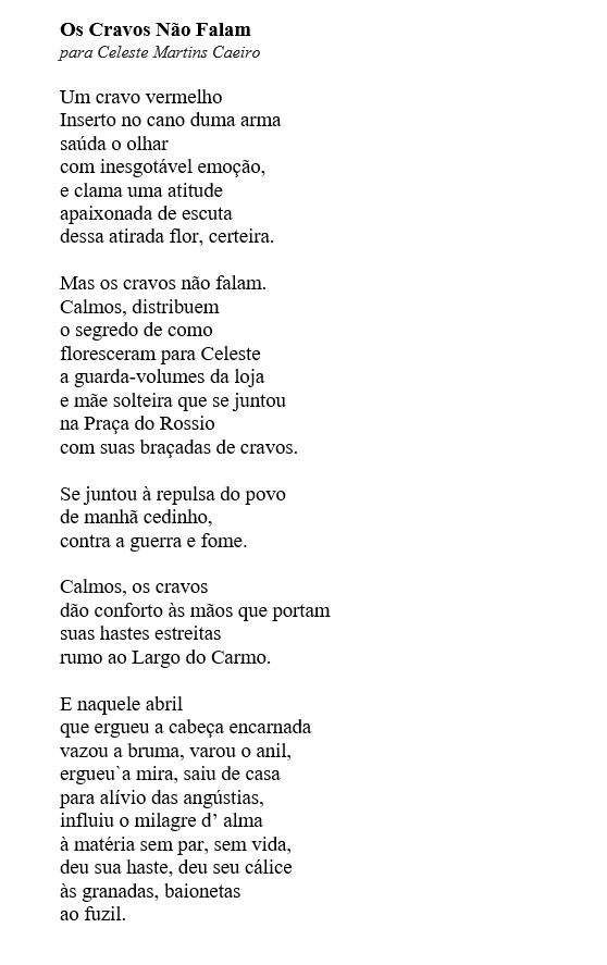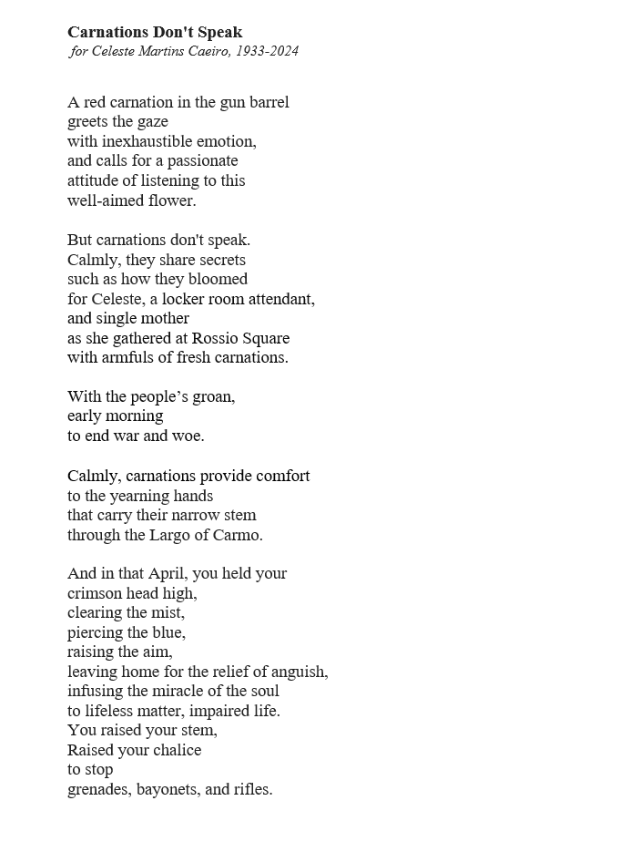 Celeste Caeiro became a national symbol and a symbol of the Portuguese revolution. On April 25, 1974, Celeste Caiero worked in a restaurant celebrating its one-year anniversary. The owner bought carnations to offer to customers, but the incidents of the day led Celeste to keep them and offer them flowers to the soldiers in Rua do Carmo.