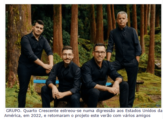 Quarto Crescente is nothing more or less than the name given to four friends who got together several times to play for various artists (Evandro Meneses, Delmindo Marco Meneses, André Coelho, and José Sousa). When musicians were needed to accompany an artist, this was the first option they considered. As time went by, and as musical moments became more frequent, we came up with the idea of giving this quartet a name, as it was always the same for the various concerts we played. So, a poll was set up on Facebook so that our friends could suggest names for the quartet, and “Quarto Crescente” was suggested by our friend and music producer Emiliano Toste. Recently, and with the desire to sing and play Azorean popular music, which was part of my childhood and musical growth, I invited three friends to join the quartet so that we could offer the public a gap that currently existed in Terceira: groups exclusively playing Azorean popular music. I grew up listening to Tributo da Ilha de São Jorge, Alma Popular (who, curiously enough, will return to the stage), all the Azorean singers on the illustrious CD “7 anos de música”, among other groups who limited themselves to interpreting and creating the most genuine Azorean music possible. In fact, the first songs I wrote as a teenager had this popular and Azorean content, songs that are now part of our repertoire. That’s why our friends Tibério Carreiro, Paulo Rosa, and Delmindo Meneses joined Quarto Crescente to perform these songs and other covers of Azorean popular music.