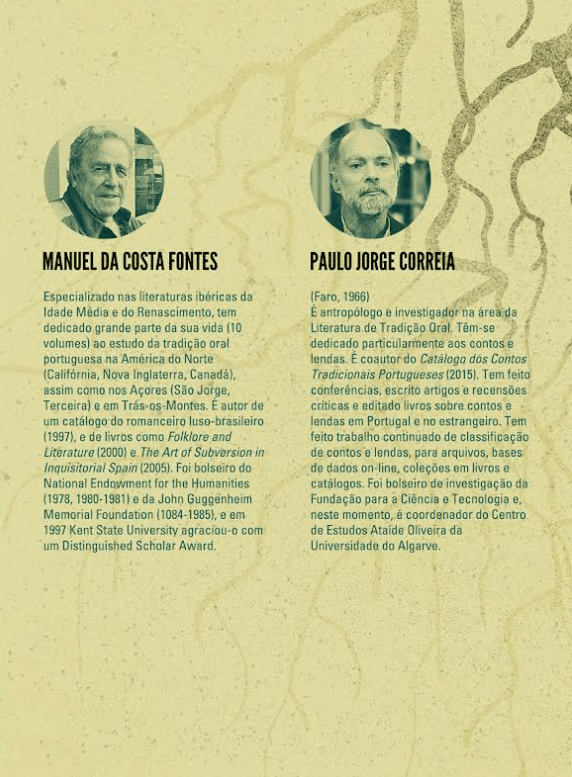 Voltando aos autores e apesar dos seus trabalhos serem publicamente reconhecidos não seria correto da minha parte suplantar este aspeto. Paulo Jorge Correia nascido em Faro no ano de 1966 é antropólogo e investigador na área da Literatura de tradição oral. Tem-se dedicado particularmente aos contos e lendas. É coautor do Catálogo dos Contos Tradicionais Portugueses, publicado em 2015. Tem feito conferência escrito artigos e recensões críticas e editado livros sobre contos e lendas em Portugal e no estrangeiro bem como trabalhos continuados de classificação para arquivos, bases de dados online, coleções livros e catálogos. Foi bolseiro de investigação da Fundação Para a Ciência e Tecnologia e atualmente é coordenador do Centro de Estudos Ataíde Oliveira da Universidade do Algarve. Relativamente a Manuel da Costa Fontes, nasceu na freguesia dos Altares, no ano de 1945 e emigrou para os Estados Unidos da América em 1961. Tirou o quarto ano no Liceu de Angra e frequentou o Modesto Junior College (A.A., 1964). Alistou-se nos Fuzileiros Navais Americanos (1964-1967), passou um ano no Vietname e completou o seu serviço militar com o grau de Sargento. Frequentou o Stanislaus State College (B.A., 1969), University of California, Berkeley (M.A., 1972), e University of California, Los Angeles, onde se doutorou em Línguas e Literaturas Hispânicas (Ph.D., 1975). Foi professor catedrático de espanhol e português, na Kent State University (1975-2008), onde foi premiado com um Distinguished Scholar Award (1997) e doze Summer e Academic Year Research Appointments. O National Endowment for the Humanities concedeu-lhe Fellowships for Individual Study and Research em duas ocasiões (1978, 1980- 1981). A John Simon Guggenheim Memorial Foundation também o distinguiu com uma bolsa (1984-1985). Especializa-se nas Literaturas Ibéricas da Idade Média e do Renascimento, tem dedicado parte da sua vida à tradição oral portuguesa na América do Norte, assim como nos Açores (São Jorge e Terceira) e em trás os montes. Em 1997 Kent State University agraciou-o com um Distinguished scholar award.