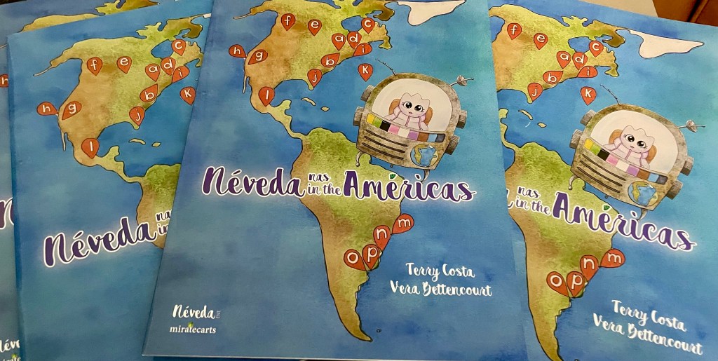 The book “Néveda in the Americas” toured Canada, the USA, and Uruguay last year and was distributed to libraries and schools in Uruguay with the support of the Director of Culture of the Intendencia de Colonia, Dr. Eduardo Bonansea. Last spring, it toured Europe and is available in Brussels at the Petite Portugaise bookshop, a stone’s throw from the European Parliament. In the Azores, the bilingual version of the book is part of 4th-grade English classes and vocational schools for tourism courses. This fall, the Regional Reading Plan committee added the book to the recommended list for preschool education, reading aloud, and guided reading.