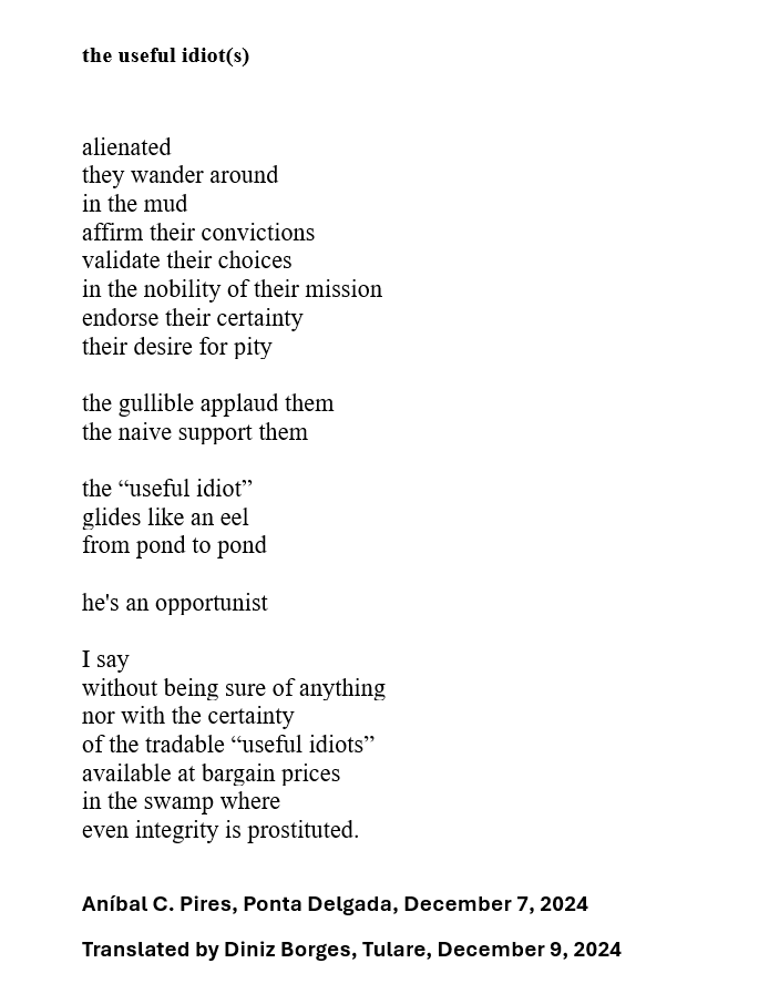 We begin with a powerful and daring poem from Aníbal C. Pires, a Portuguese poet who lives in the Azores. We will feature mostly Portuguese Poets in translation, but others from various parts of the world in English (whether their original language or translation).