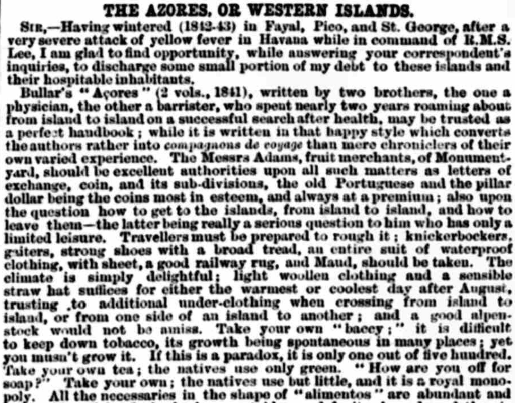 Sir.—Having wintered (1842-43) in Fayal, Pico, and St. George, after a very severe attack of yellow fever in Havana while in command of R.M.S. Lee, I am glad to find opportunity, while answering your correspondent’s inquiries, to discharge some small portion of my debt to these islands and their hospitable inhabitants.