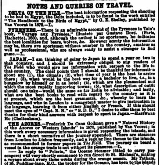 The Azores.—Frederick Du Cane Godman gave a “Natural History of the Azores or Western Islands” in 1870, published by Van Voorst; in this work every necessary information is given respecting the islands, and there is a short narrative of the journey appended. There are steamers from London to Lisbon frequently, and a regular line thence to the islands, as recommended in former papers in The Field. The journey on board a vessel in the orange trade is not without its pleasures.—L.