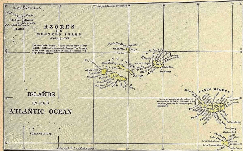 Ponta Delgada, the principal town of these islands, contains about 1400 inhabitants. The streets are well paved and clean. There is an hotel or boarding-house, kept by Bird, an Englishman; charges from 4s. 3d. to 20s. per day, according to the accommodation required. The cooking is good, the beds are clean, and the table liberally supplied. The house has been full the whole of this season; but it possesses considerable expansive capabilities. There is also a very dirty Portuguese hotel, a Café Central, a club, a theatre, a branch bank of the Banco Lusitano, Lisbon; agents in London the Alliance Bank (Limited). The manager at St. Michael’s, Clement Joaquim da Costa, speaks English. There is a public market twice a week, where poultry, vegetables, fruit, eggs, butter, and all kinds of other things are sold. There are carriages, with mules or horses, for hire, and ambling asses and porters for baggage. There are no lodgings or furnished or unfurnished apartments to be had, nor are there, as a rule, any furnished houses to let; nor are any of the residences there fitted with the conveniences or furniture we are accustomed to find in very moderate houses at home, as a few chairs, two card tables, a piano, and a hearthrug constitute all that is considered necessary for a drawing-room, whilst the bed and other apartments are fitted up in a like simple manner. In the kitchen two or three three-legged iron pots, with some earthen pipkins and a water jar, constitute the batterie de cuisine of a Portuguese cook. Pianos cannot be hired, and are expensive to buy, new or old, being subject to a duty of about £6.