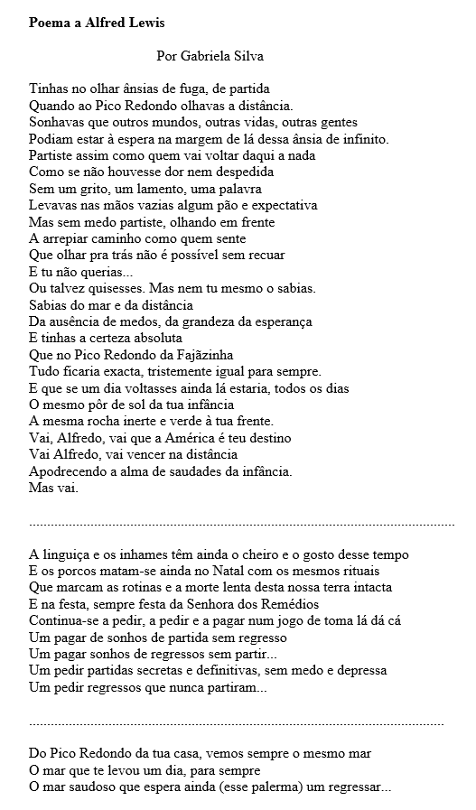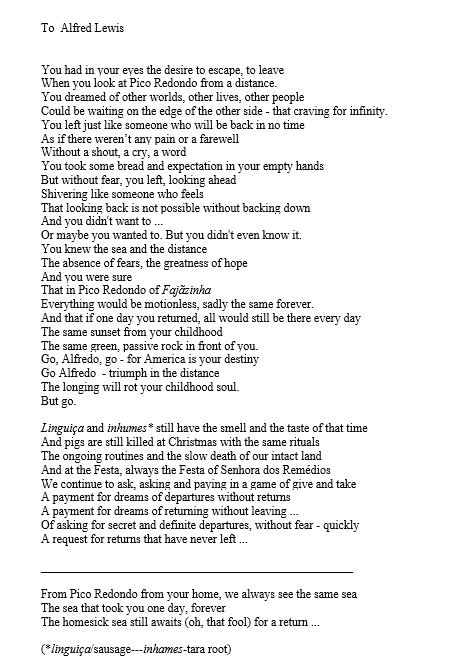 Translated by Diniz Borges and included in the bilingual anthology with over 100 poets from the Azores and the Azorean Diaspora Into the Azorean Sea.