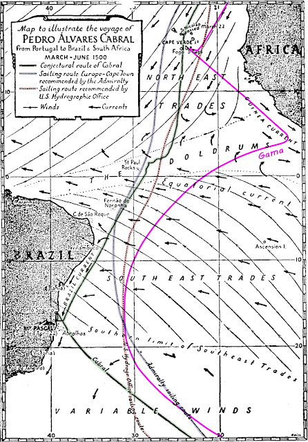 A viagem de Pedro Álvares Cabral é um excelente exemplo dessa dinâmica. Socorrendo-me de um autor insuspeito, o Almirante Samuel Eliot Morison, um oficial da Marinha dos EUA conhecido e respeitado pelos seus trabalhos de História marítima, tracei a rota aproximada da primeira viagem de Vasco da Gama em 1497 sobre a gravura onde Morison, no livro “Portuguese Voyages to America in the Fifteenth Century” de 1940, compara a rota de Cabral em 1500 com as recomendações do Instituto Hidrográfico dos Estados Unidos e do Almirantado Britânico aos veleiros do século XX.