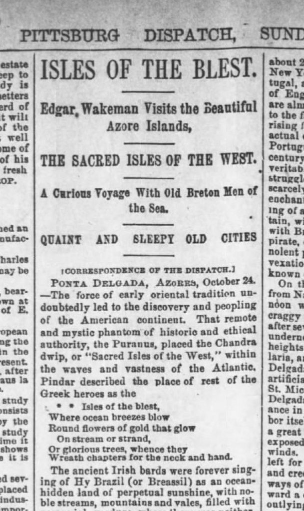 Nota do tradutor: Uma tarde amena, depois do vento. Inventei tempo livre para traduzir o primeiro capítulo do potencial livro, nunca compilado, editado e, julgo, traduzido, de Edgar L. Wakeman. É um texto bonito, o primeiro de vários com uma interessante descrição de uma estadia em São Miguel. Foram publicados em 1889 em vários jornais americanos. À falta de título para este conjunto açoriano das suas «Deambulações», que o levaram pelo mundo e lhe deram temporariamente alguma fama, chamei-lhes «Deambulações nos Açores em 1889». A este primeiro artigo-capítulo, chamei «Viagem de Nantes a Ponta Delgada». O resto, claro, é do autor