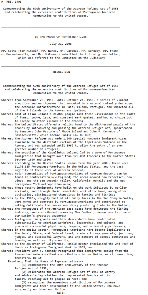 The following is the House of Representatives resolution commemorating the 50th anniversary of the Azorean Refugee Act of 1958.