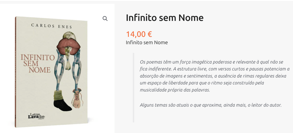 Mas vamos aos poemas. Carlos Enes apresenta, em Infinito Sem Nome, uma poesia visceralmente táctil, marcada por imagens evocativas, onde o universo natural e as emoções se enlaçam. O autor transita entre a contemplação do efémero e a busca pelo essencial, traduzindo as suas inquietudes em imagens poéticas.