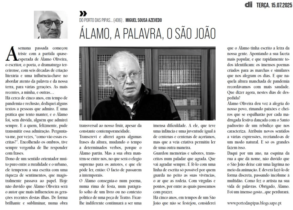 A semana passada começou triste com a partida quase-esperada de Álamo Oliveira, o escritor, o poeta, o dramaturgo terceirense, com seis décadas de criação literária e uma influência-chave no abordar atento da palavra e da nossa terra, para várias gerações. As mais recentes, a minha, e outras…