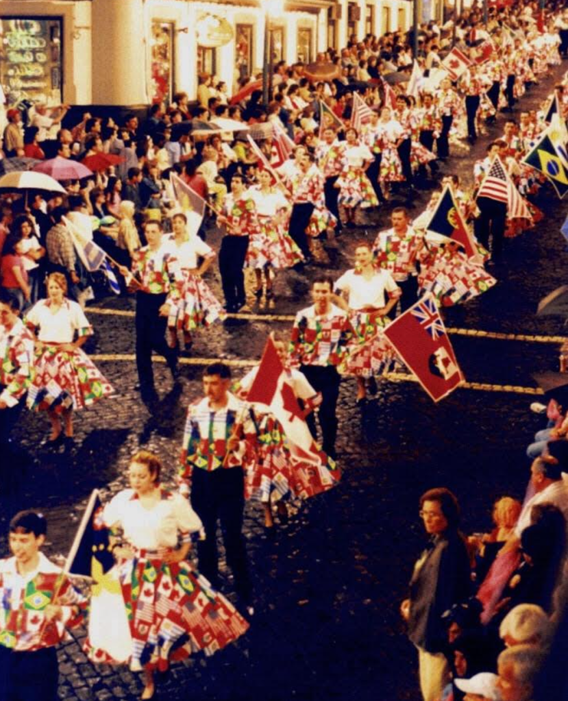 Katharine F. Baker’s first photo of Álamo, performing in the Azores’ Direção das Comunidades ensemble, singing and dancing its way down Rua da Sé in central Angra during Sanjoaninas 2004. After their number, a few of us at a parade watch-party on a balcony repeatedly shouted Álamo’s name in unison until he turned to respond.