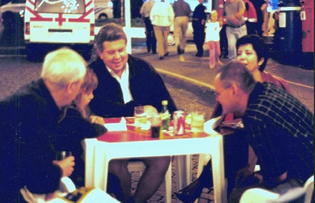 Front table: José Carlos Frias (proprietor of Livraria SolMar), Urbano & São Bettencourt, Helena Chrystello, Vamberto Freitas, Álamo. Next table: Katharine and visiting California friends Betty Bispo, Jonas Waxman