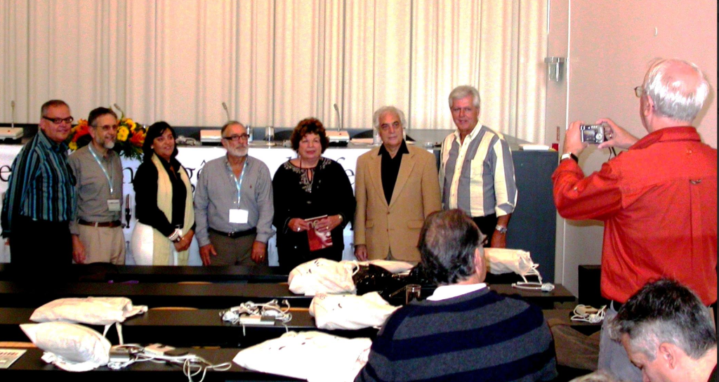 Diniz Borges, José Luís da Silva, Rita Dias, Décio Oliveira, Lara Gularte, João Luís de Medeiros, Tony Goulart at the Colloquium Escritas Dispersas ~ Convergência de Afectos: Álamo snapped a souvenir portrait of the Comunidades director with California participants.