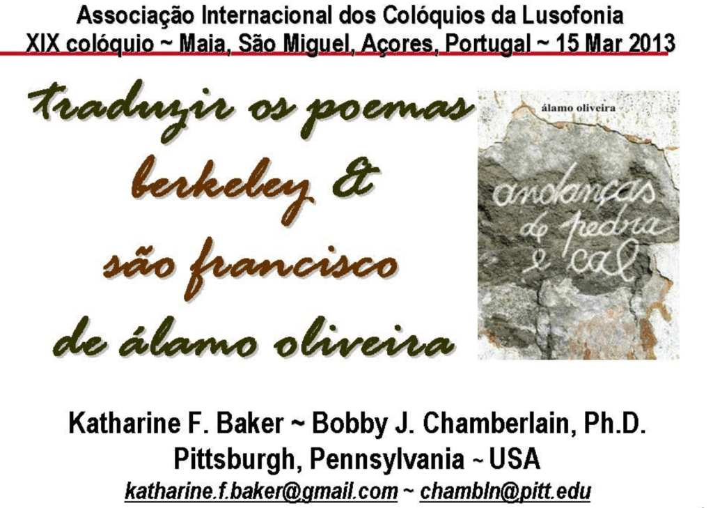 Cover slide for Katharine’s presentation in Portuguese of the translation of two of Álamo’s poems at the 19th AICL colloquium.