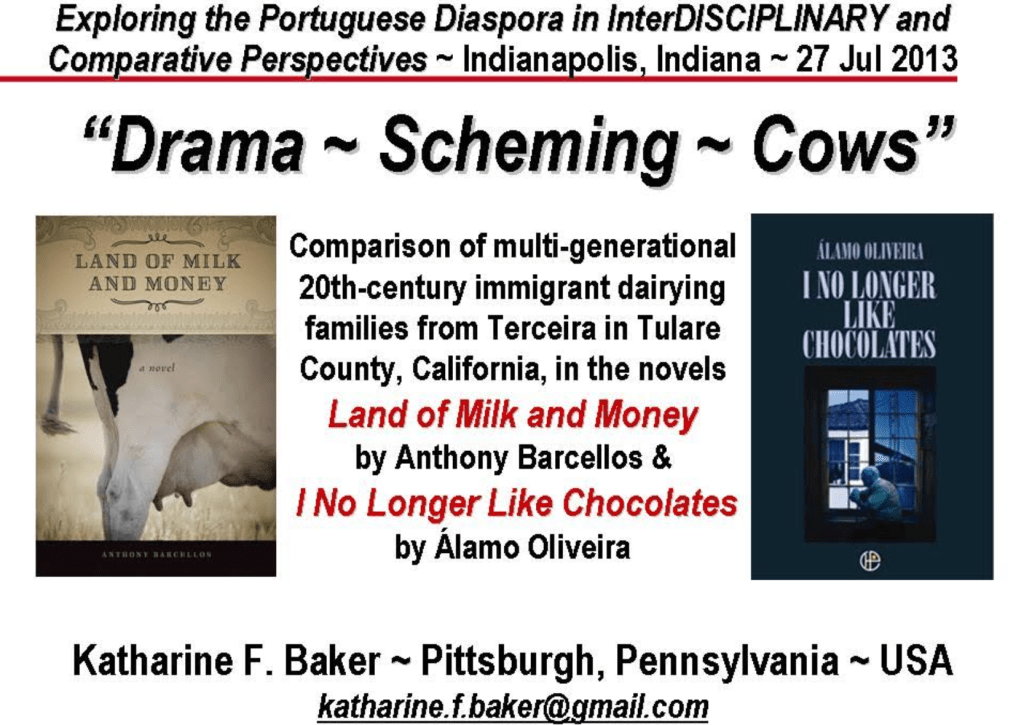 Cover slide for Katharine’s presentation in English comparing the novels I No Longer Like Chocolates and Land of Milk and Money at the Exploring the Portuguese Diaspora conference.