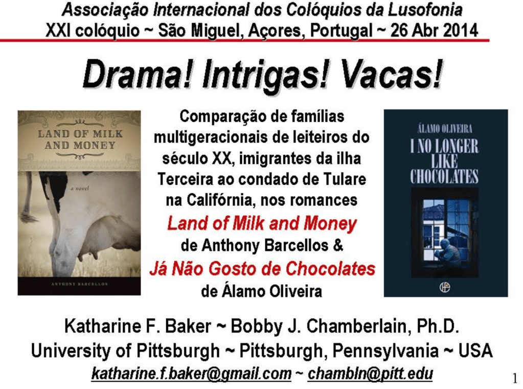 Cover slide for Katharine’s presentation in Portuguese comparing I No Longer Like Chocolates and Land of Milk and Money at the 21st AICL colloquium.