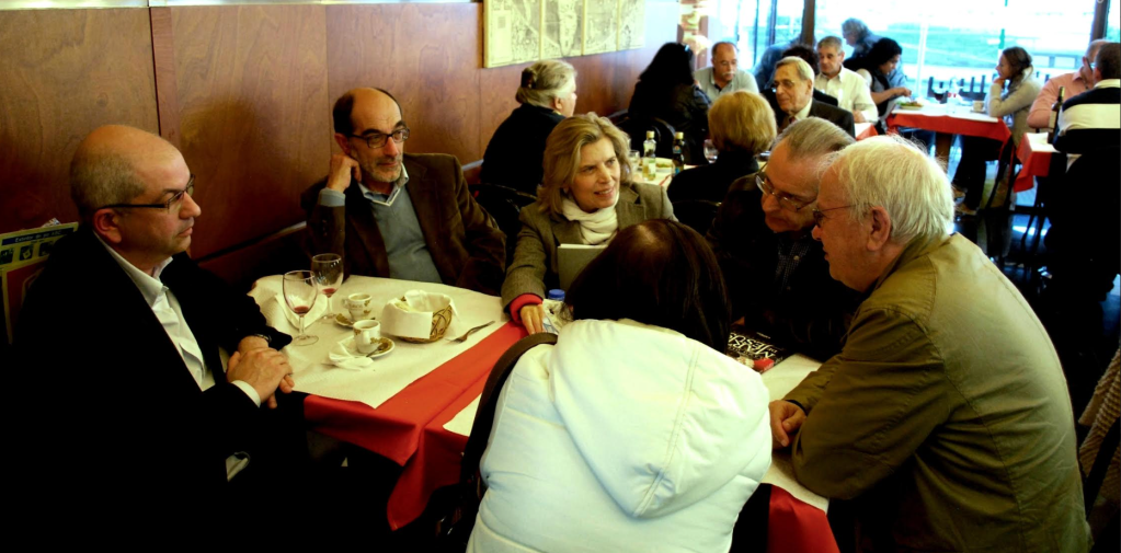 In the foreground, counterclockwise from left: João Luís de Medeiros, Caetano Valadão Serpa, Olegário Paz, Hélia & Eduíno de Jesus, Vasco, Álamo, Diniz, Ivo Machado, Katharine, Judite Jorge, Fernando Aires, Daniel de Sá (partially hidden)Colloquium Escritas Dispersas ~ Convergência de Afectos. Lunch at O Miroma, featuring cozido (local specialty: large clay potfuls of stew slow-cooked underground in fumaroles).