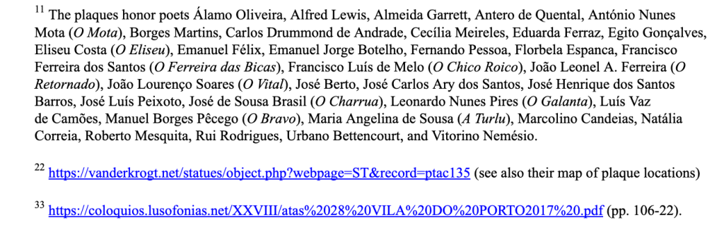 Then I hit the figurative motherlode: a webpage with an online compilation by Dutch tourists René and Peter van der Krogt of all but one plaque, along with photos and transcriptions. I’d found my topic. Toronto author Emanuel Melo agreed to collaborate on the talk, including with co-translating all thirty-four poetic citations. I was able to locate a photo elsewhere online of the only plaque missing from the van der Krogts’ page, so Emanuel’s and my album was complete.