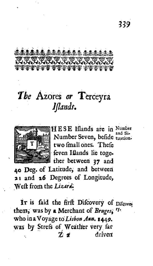 {Discovery.} It is said the first Discovery of them, was by a Merchant of Bruges, who in a Voyage to Lisbon Ann. 1449. was by Stress of Weather very far driven to the West, and at last made these Islands, which he found destitute of Inhabitants, and named them the Flemmish Isles. He finally got to Lisbon, where by boasting of this Discovery, he gave the Portuguese such Hints of their Situation, that they immediately set sail, and took Possession of them; nay Anthony Gonzalo [António Galvão (c. 1490–1557)] in his Treatise of the Discovery of the World [Tratado dos Descobrimentos], affirms, that Prince Henry went with them.