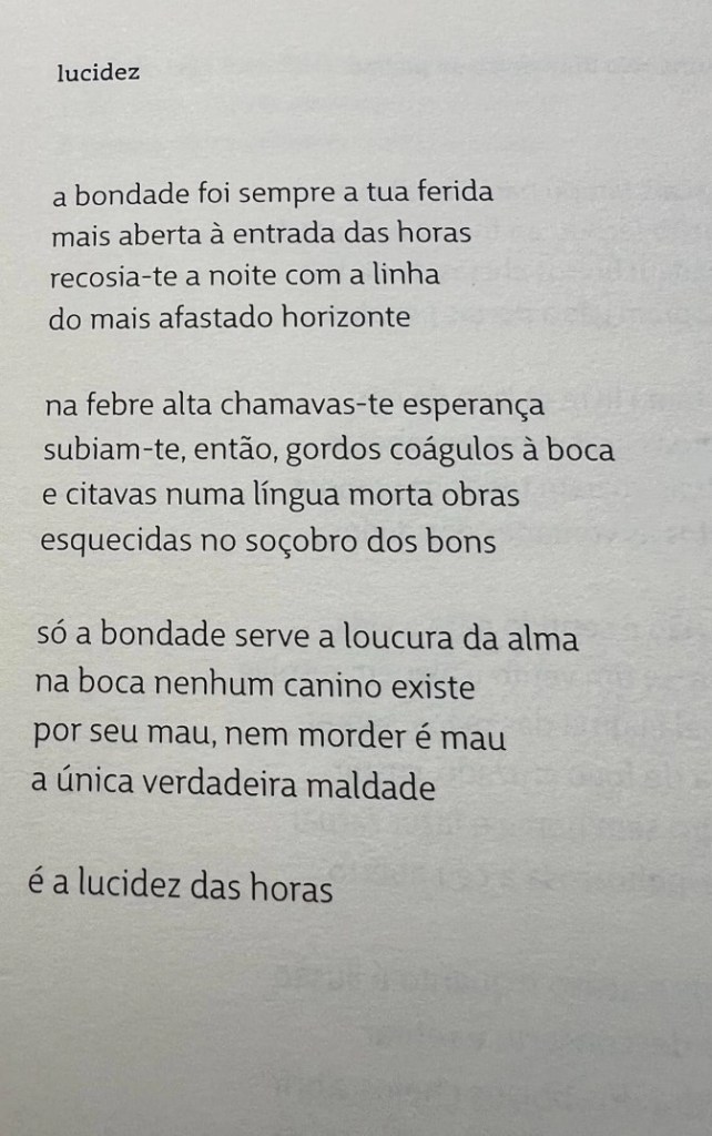 Sou levado a considerar que este conjunto de poemas tende a desafiar os cânones da poesia convencional, propondo uma nova poética que ao interrogar o mundo, a sociedade e a condição humana, leva o leitor mais atento à transformação de um universo sentimental e emocional, muitas vezes subjugado por uma civilização que atira a poesia para o olvido, a fim de poder estender os seus tentáculos populistas e operar o ódio, sem encontrar oposição. Ora, Só O Grande Pão, de que nos devíamos alimentar, pode derrubar e recusar a ignorância que a todos manipula, promovendo o esquecimento de que só o amor é fio invisível que cose os dias, cria empatia e proximidade, derruba a superioridade racial e elimina nacionalismos, porque o pão é a primeira obra da terra transformada, em alimento de amor, por mãos humanas.
