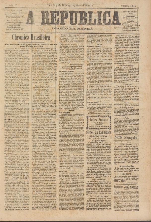 Many topics were covered in its pages. The implementation of the republican regime on the island of São Miguel, the Law of Separation, considered the ideal weapon to combat clericalism (“manifestation of international banditry”), the popular demonstrations in São Miguel in favor of the Republic and against the Clergy (“vivo protesto contra o maior inimigo da nossa independência ? the clerical reaction”), the unfolding of World War I, describing submarine attacks on the coast of the island of São Miguel, for example, or commenting on the fact that the newspaper’s typographers had been called up for preparatory military training…