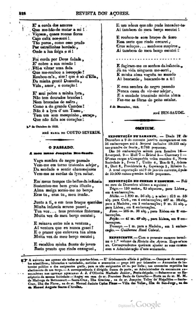 Dos dois irmãos, Joaquim era o mais velho e José era o mais novo, separando-os 16 anos. Por volta de de 1840 — ou talvez antes, quando José ainda estava no berço — Joaquim emigra para o Brasil, onde se fixa e, década e meia depois, vem a falecer. Em 10 de Janeiro de 1853, poucos anos antes da morte de Joaquim, a «Revista dos Açores», dirigida pelo notável José de Torres, publica «O Passado», o quarto e último — e francamente inspirado (quem sabe da poda que o diga) — de um conjunto de quatro poemas de José. Dedica-o ao irmão. Foi escrito em 5 de Dezembro de 1852, quando tinha apenas 17 anos. O primeiro poema do conjunto, «O Judeu», que se encontra no número de 31 de Março de 1852 da revista, vinha acompanhado da seguinte apresentação do novo poeta: