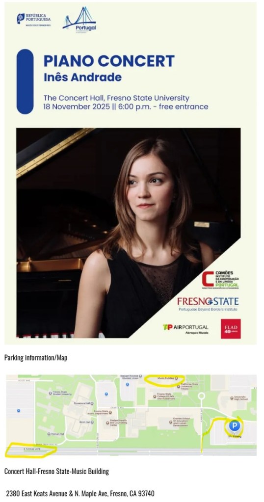 We invite the entire Central Valley community — Portuguese and friends from every culture — to join us for this remarkable occasion. Let this evening serve as the first light of a year of remembrance, celebration, and gratitude. As Inês Andrade’s piano fills the hall, each note will echo six decades of Portuguese presence at Fresno State: decades marked by dedication, resilience, and the unbroken thread of cultural kinship linking the islands, the continent, and California’s boundless heart.