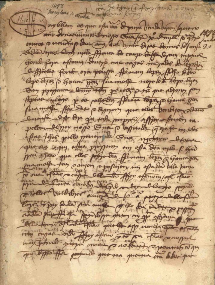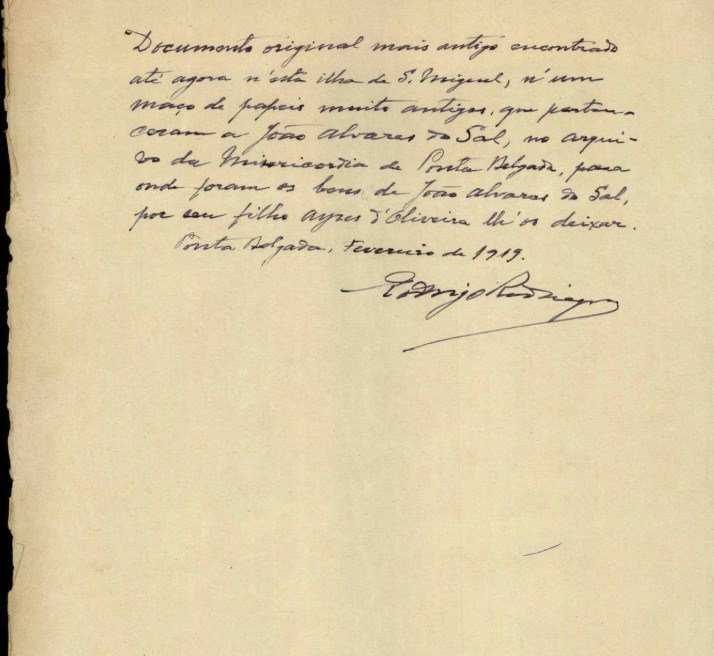 Thanks to Rodrigo Rodrigues’ article, we can better understand the note he left in 1919 in the chapel where this document is kept: in addition to the transcription he presents, identifying the parties involved and other people mentioned, he also adds information about a subsequent sale of the same land. Also made in Vila Franca do Campo, on September 28, 1507, by Friar Estêvão Vaz to the merchant João Álvares do Sal, this sale included other properties and in the respective deed, which is transcribed in another document also from the Ponta Delgada Misericórdia Archive, this previous one, from 1492, is identified in detail.