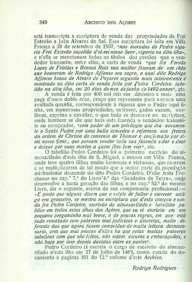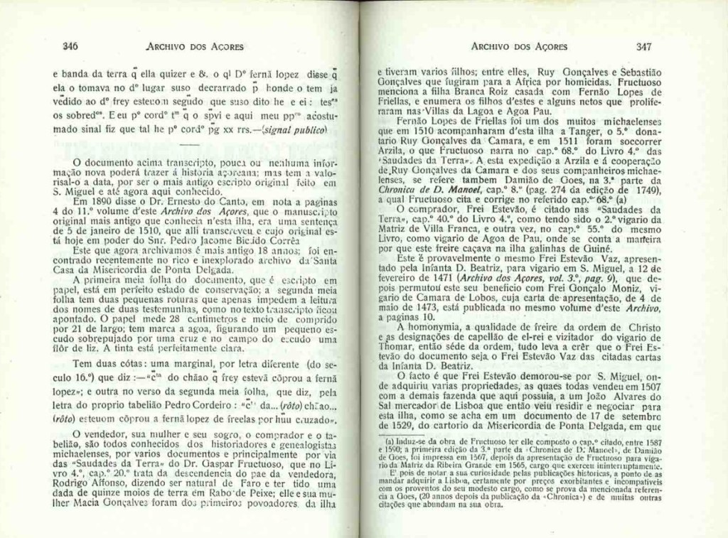 [1] Rodrigo Rodrigues – The oldest document written on the island of São Miguel, known to date: deed of sale made in Vila Franca do Campo in 1492. In Arquivo dos Açores. Ponta Delgada. Vol. 13 (1920), pp. 344-348 – https://ccbibliotecas.azores.gov.pt/cgi-bin/koha/opac-NPdetail.pl?biblionumber=475398.