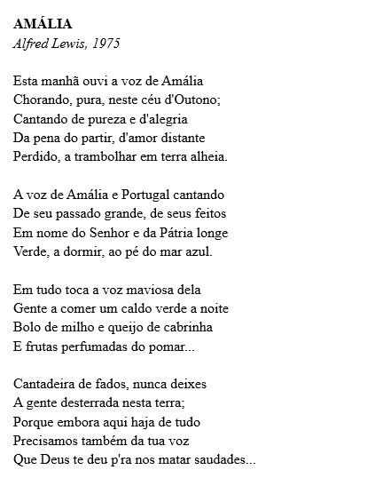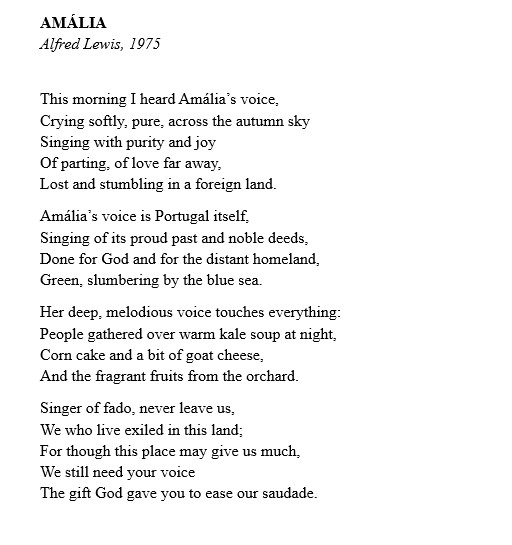 Talvez, pelo rádio ou na vitrola, tenha ouvido Amália cantando. O poeta tem um arrebate em virtude da comunhão do idioma nativo, da história marítima de Portugal, e da sofreguidão da ausência do amor que Amália e Lewis conheceram em situações diferentes. Essa identidade, sentimento de pertença, traz ao poeta alegria vital para seu exílio. Ele diz com sabedoria sobre a voz fadista que “tudo toca”, incluindo a mesa de refeição com seus pratos favoritos da infância. E assim tocando tudo, Amália faz o poeta sofrer menos.