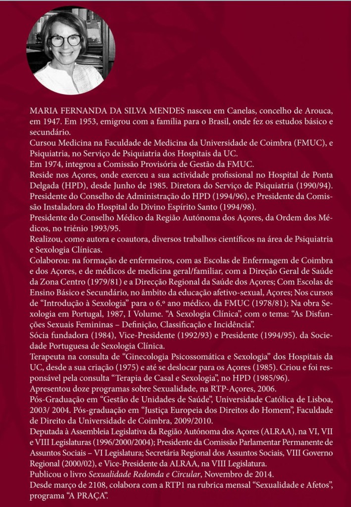 Fernanda Mendes, psiquiatra, política e governante aposentada, publicou o seu primeiro livro em 2014, intitulado Sexualidade Redonda e Circular, que tive o prazer de apresentar publicamente num ambiente algo diferente para mim, precisamente no Hospital do Divino Espírito Santo, aqui em Ponta Delgada. O desafio que a autora então me lançou foi complexo: estivemos perante um público que combinava leitores vindos de todos os quadrantes da vida, mas também médicos e sexólogos híper-especializados vindos de outras sofisticadas paragens, como Allen Gomes. Também ela é uma conhecida sexóloga, e a sua prosa de então foi decididamente um acto de coragem numa terra habituada a literatura sisuda e quase toda de meras insinuações sexuais nas suas páginas. Em Sexualidade Redonda e Circular a linguagem era bem outra, integrava o desejo e prazer, ou a dor de cama numa tradição conservadora como a nossa e dominada ainda pela hipocrisia social e religiosa, uma cultura do silêncio que acha estranho falar-se publicamente nestas questões, que também já dominam quase obsessivamente, como se sabe, até o discurso político noutros países. Só que a surpresa para mim foi encontrar um grupo de leitores e pensadores que aceitaram abertamente esse desafio médico-intelectual lançado nessa singular obra entre nós.