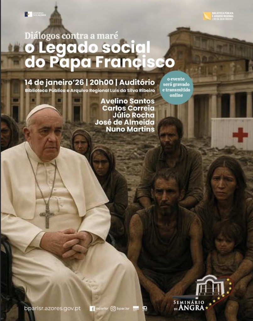 O ciclo “Diálogos contra a Maré”, promovido pela Biblioteca Pública e Arquivo Regional Luís da Silva Ribeiro e pelo Seminário de Angra do Heroísmo, prossegue no próximo 14 de janeiro, pelas 20h00 (13h00 na Califórnia e em Vancouver e 16h00 na Costa Leste dos EUA e do Canadá) , com o seu sexto encontro, dedicado ao legado social do Papa Francisco. A sessão terá lugar no auditório da Biblioteca e reunirá Avelino Santos, Carlos Correia, José de Almeida, Júlio Rocha e Nuno Martins, num diálogo plural sobre um pontificado que redefiniu, no interior e fora da Igreja, as relações entre ética, justiça social e responsabilidade coletiva.