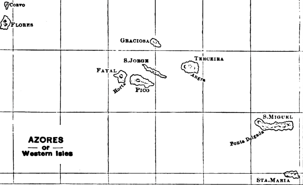 Os Açores (ou As Ilhas dos Açores)[6], Ilhas Ocidentais, Flamingos [sic] ou Ilhas Flamengas, situam-se entre os paralelos 36.º e 40.º de latitude norte e os meridianos 25.º e 31.º de longitude oeste de Greenwich[7]. São em número de nove e estão dispostas em três grupos: as Flores, a mais ocidental, e o Corvo, a mais setentrional, formam um; cento e catorze milhas[8] a sudeste deste grupo encontra-se o grupo central, consistindo no Faial, no Pico, em São Jorge, na Graciosa e na Terceira; e setenta milhas[9] mais para sul e para nascente encontram-se São Miguel e Santa Maria, o terceiro grupo. Em 1431, Joshua Vanderberg, um mercador flamengo numa viagem para Lisboa, foi levado pelo mau tempo às suas costas e, comunicando a sua descoberta à chegada a Lisboa, o governo português, entrando então naquela maravilhosa curso de aventuras que levou a sua bandeira, antes do fecho do século, ao outro hemisfério, equipou uma expedição que, no mesmo ano, descobriu os ilhéus rochosos chamados Formigas, a vinte milhas de Santa Maria, que foi visitada alguns meses mais tarde.