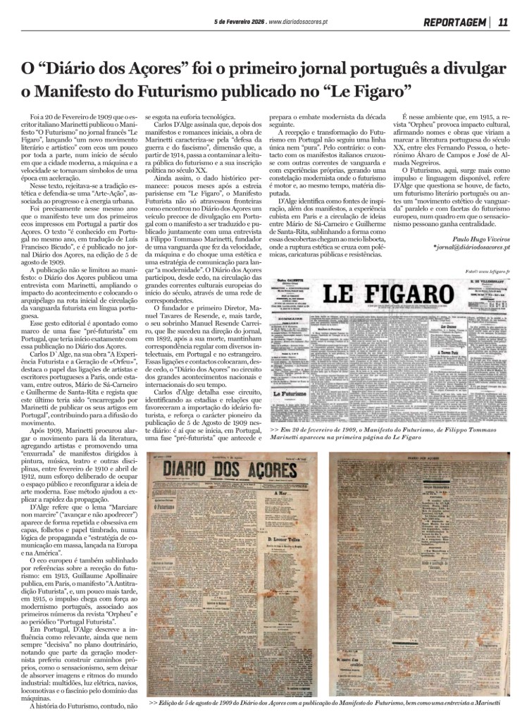 That same year, remarkably, the manifesto found one of its earliest printed receptions in Portugal—not in Lisbon, but in the Azores. The text became known in Portugal in 1909 through a translation by Luís Francisco Bicudo, published in the Diário dos Açores on August 5 of that year.