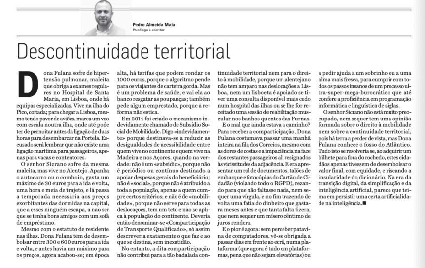 Yet even this so-called support fails to uphold the much-invoked principle of territorial continuity or the basic right to mobility. An Alentejan receives no assistance when traveling to Lisbon. A Lisboeta is not supported if an earlier medical appointment becomes available in the islands, or if a doctor prescribes rehabilitation in the thermal baths of Furnas. Continuity, it seems, is a word more often spoken than practiced.