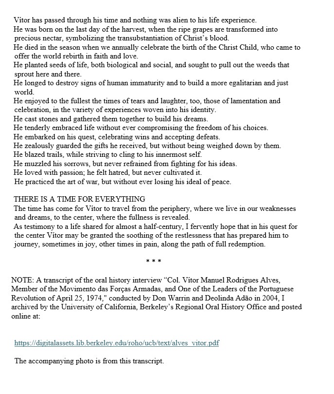 April 25, 2026April 25, 2026 Diniz Borges “Testimony”In memory of Colonel Vítor Alves, a leader of the 25 April 1974 Carnation Revolution Photo of Col. Alves, posted on his Cal-Berkeley ROHO interview. By Maria Teresa Gomes Ferreira de Almeida Alves “There is a time for everything,” as we learned in the Book of Ecclesiastes: Share this: Share on X (Opens in new window) X Share on Facebook (Opens in new window) Facebook More Share on LinkedIn (Opens in new window) LinkedIn Share on WhatsApp (Opens in new window) WhatsApp Like Loading... Related